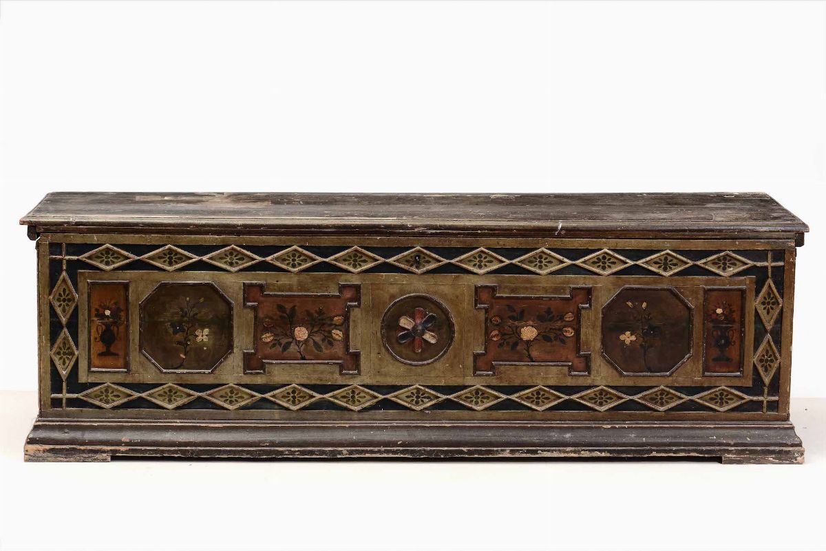 Cassapanca in legno dipinto con elementi floreali, XVIII secolo