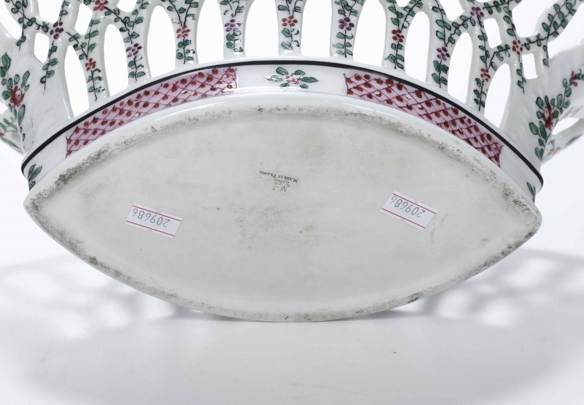 Porcellana policroma. Marca in blu. Dimensioni: cm 36x21x13