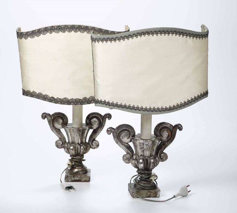 Coppia di lampade da tavolo in legno intagliato e argentato, XVIII-XIX secolo