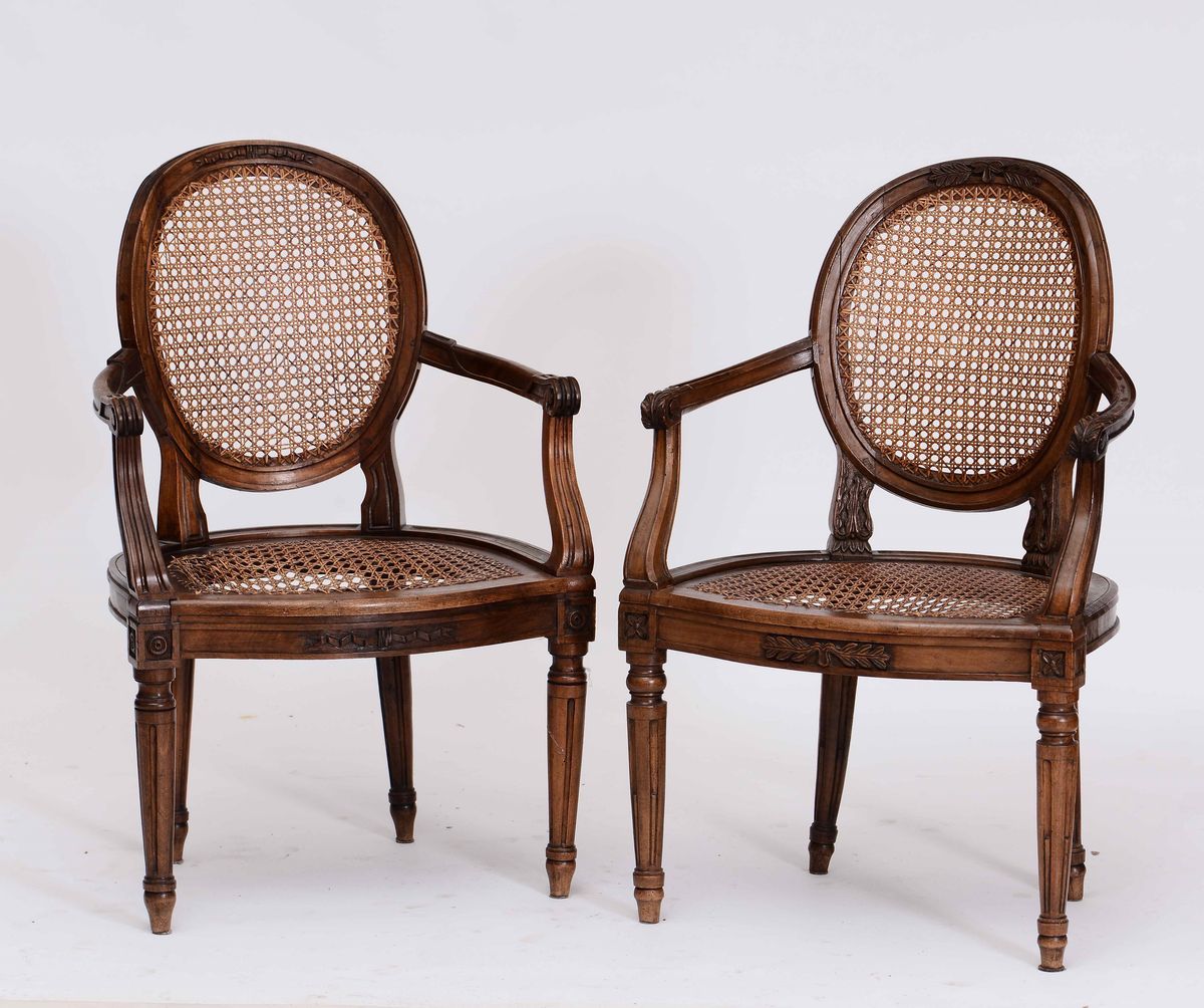 Coppia di poltroncine Luigi XVI in noce intagliato, fine XVIII secolo