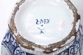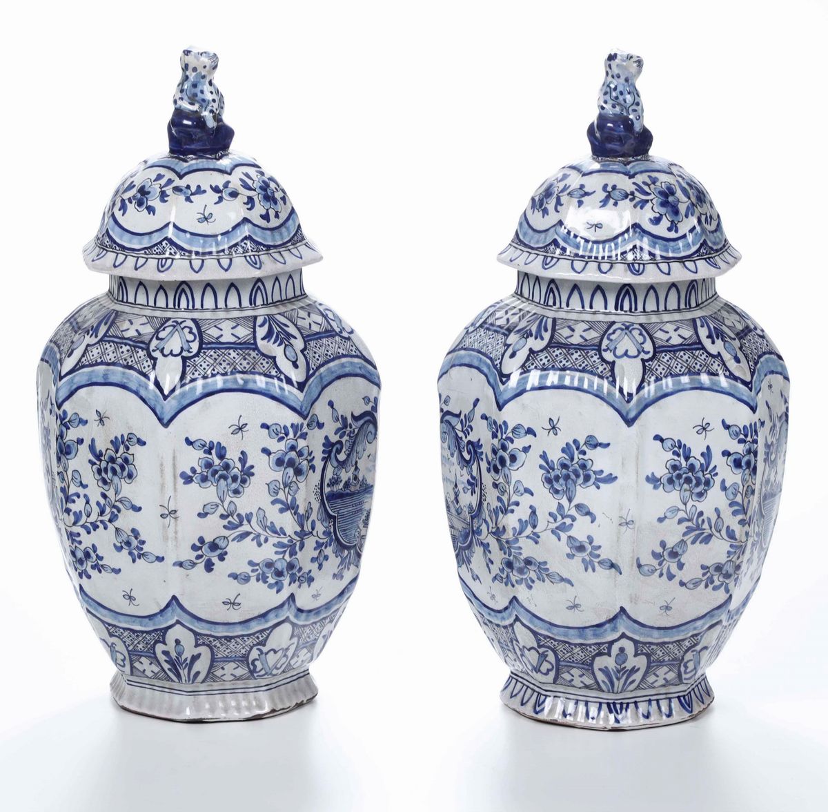 I due vasi, a sezione ottagonale e con i coperchi dalla presa a forma di leone, sono decorati in monocromia blu di cobalto con riserve a paesaggi e motivi di ispirazione orientale