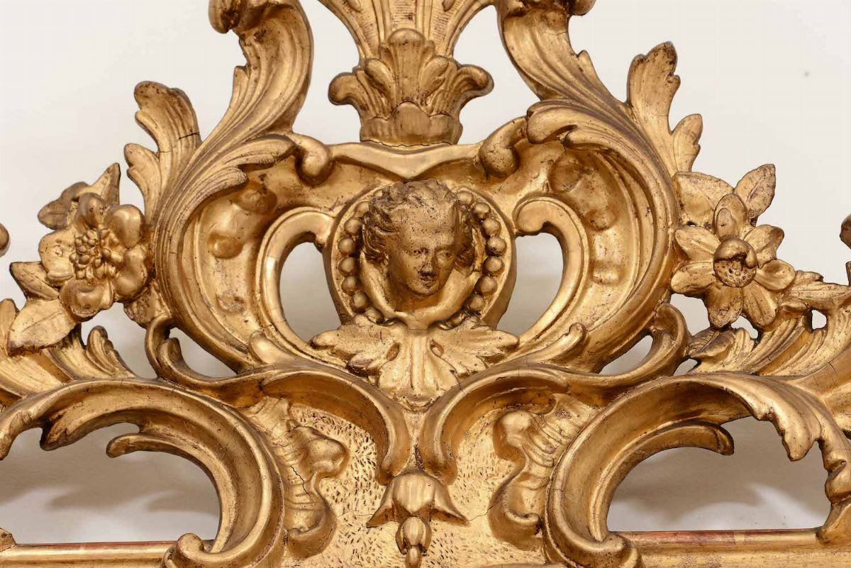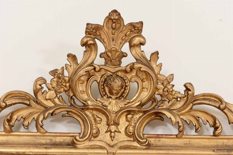 cimasa traforata a volute fogliacee, testina maschile al centro, cm 297x166