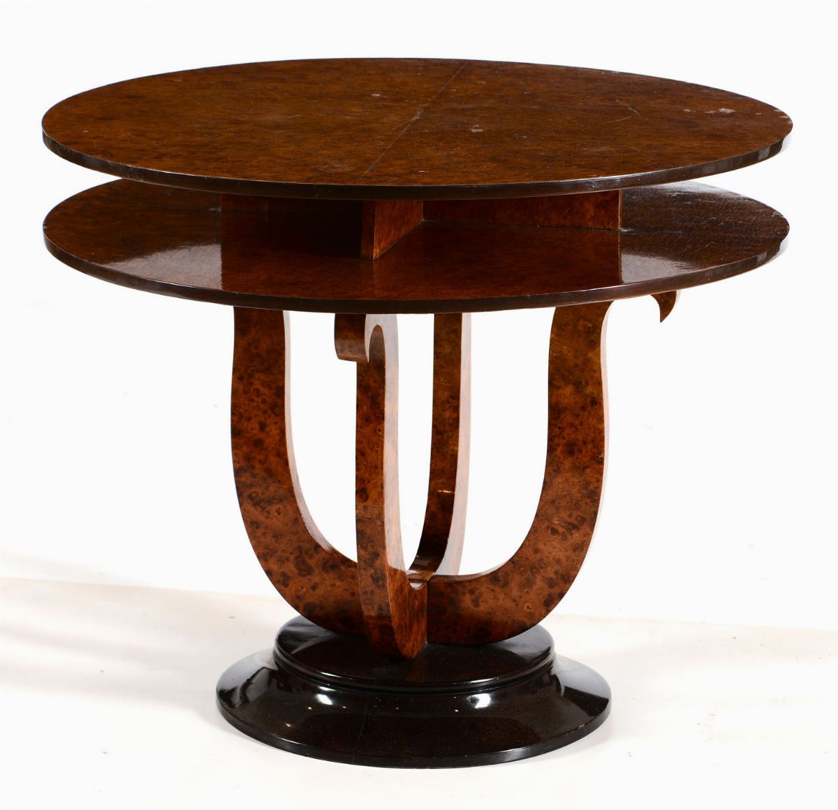 Tavolino Deco a lira impiallacciato in radica, XIX secolo