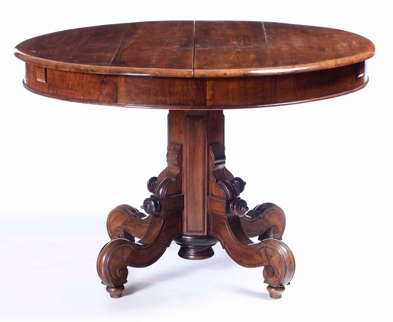 Tavolo circolare allungabile in noce e quattro sedie con schienale a lira, XIX secolo