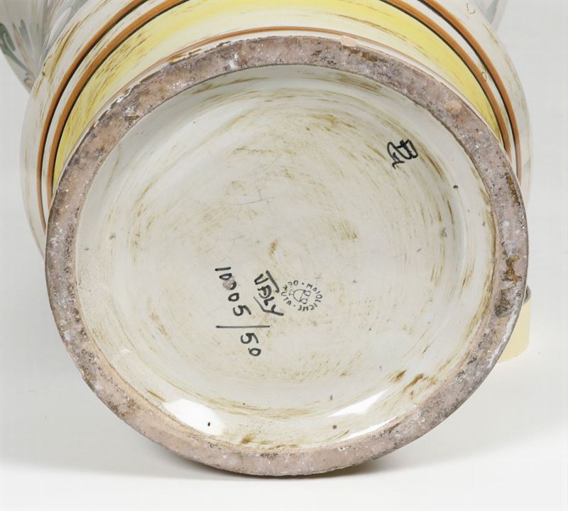Maiolica. Marca: vaso e timbro “Maioliche Deruta”, “Italy”, numero “10005/50”, “BG”, in nero. Altezza; cm 52. Ottimo stato di conservazione, minime insignificanti sbeccature alla base