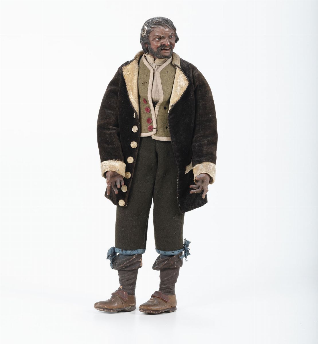 Testa in terracotta policroma, occhi di vetro, arti in legno intagliato e policromo, vesti in stoffa. Altezza cm 34