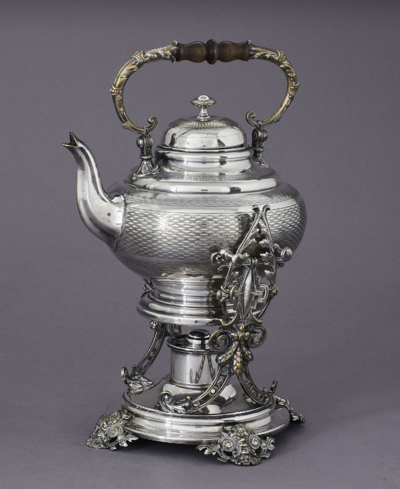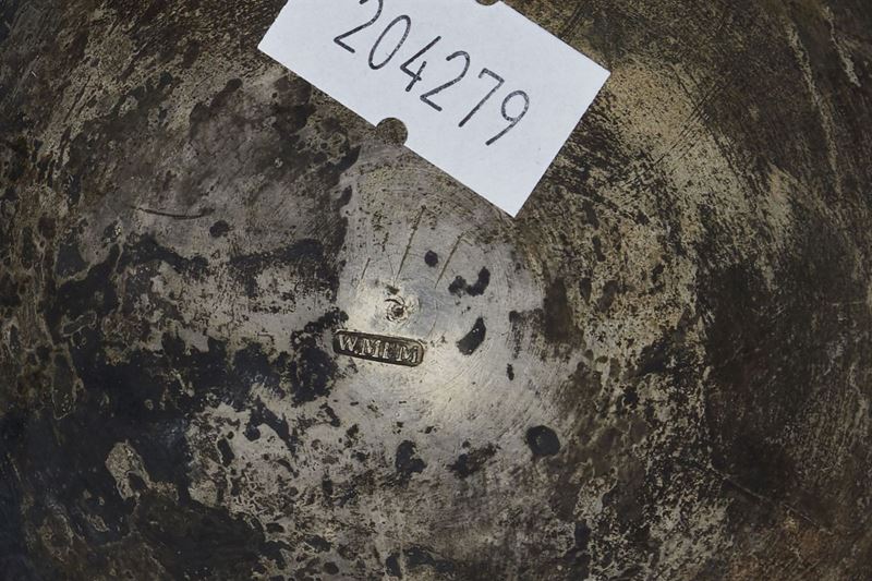 Corpo globulare con decori geometrici e supporto con base circolare e motivi a volute e fogliacei