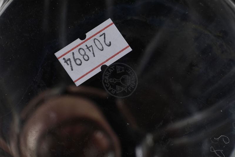Cristallo. Marca: simbolo della manifattura “Baccarat France”, inciso all’acido. Dimensioni: altezza calici cm 16,8, altezza bicchieri cilindrici cm 13. Ottimo stato di conservazione