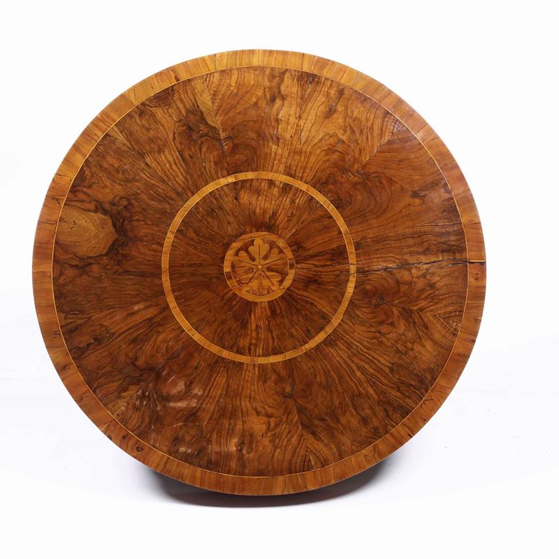 Tavolo circolare in legno lastronato ed intarsiato, XIX secolo