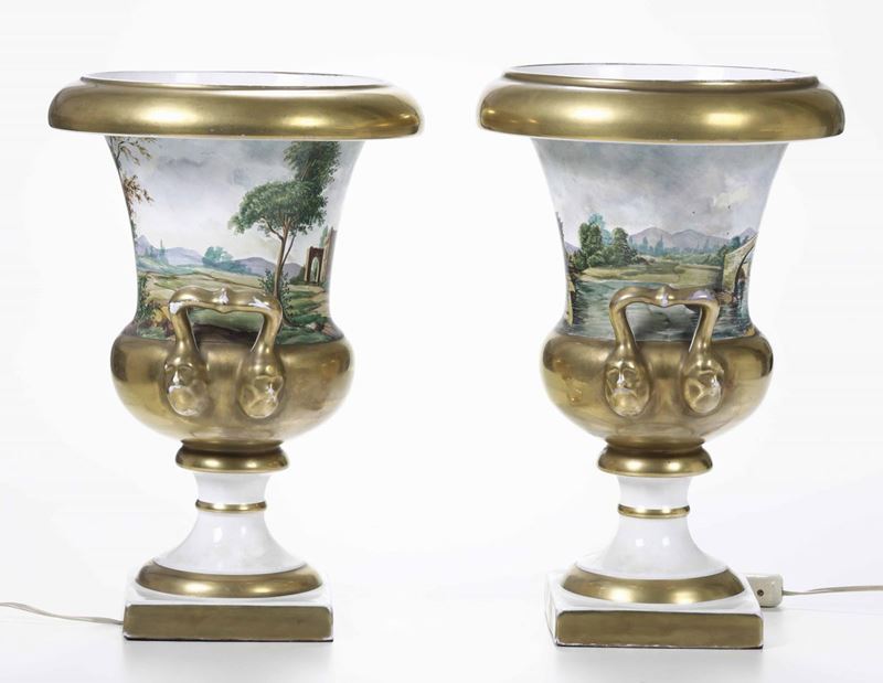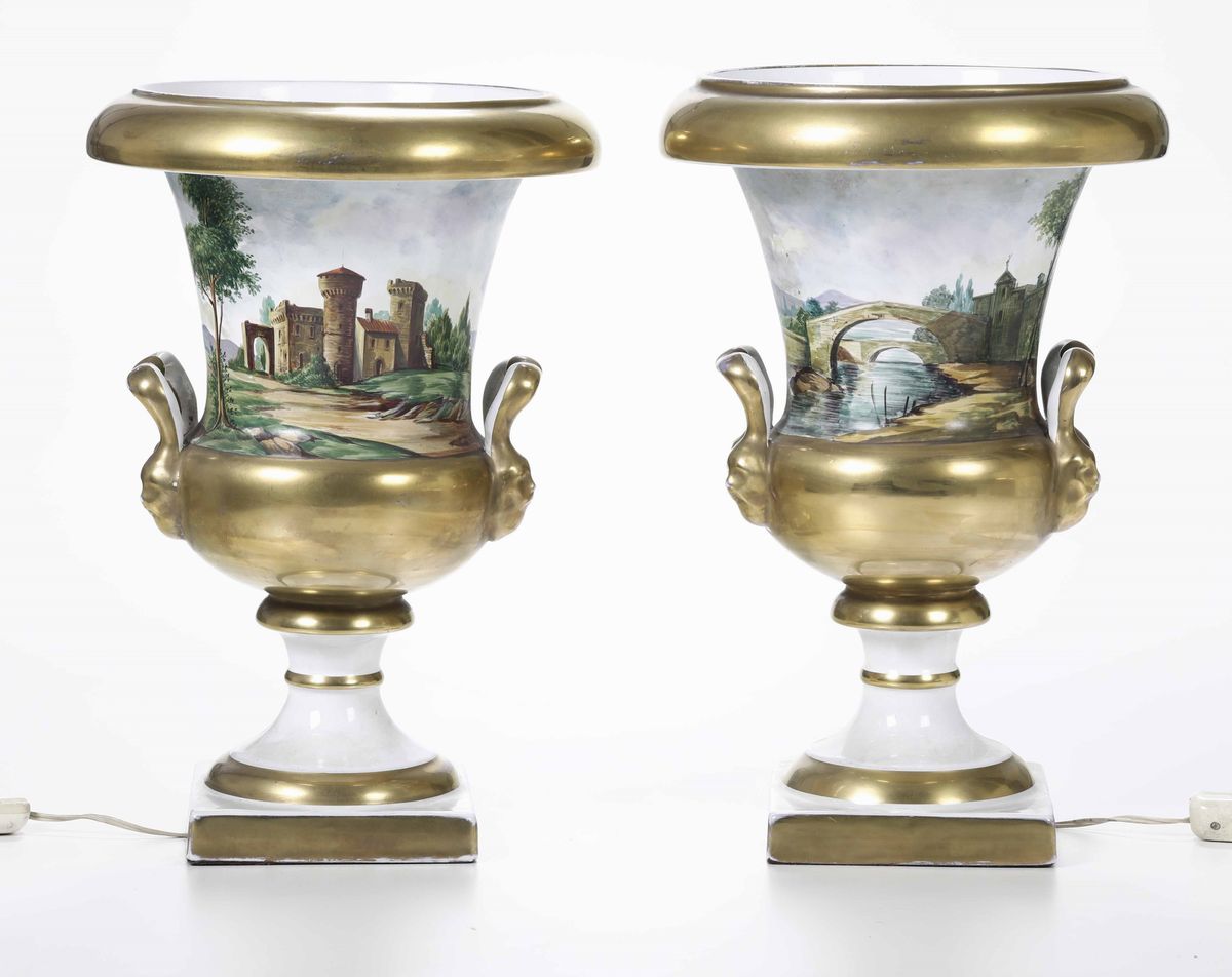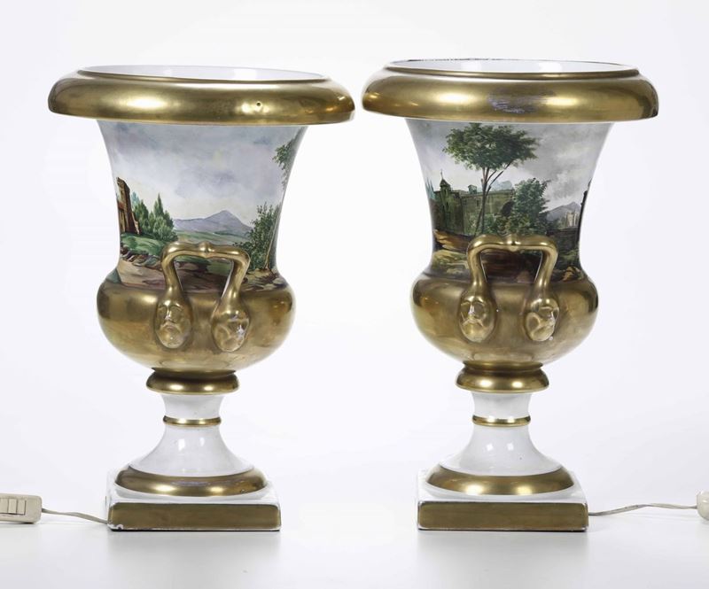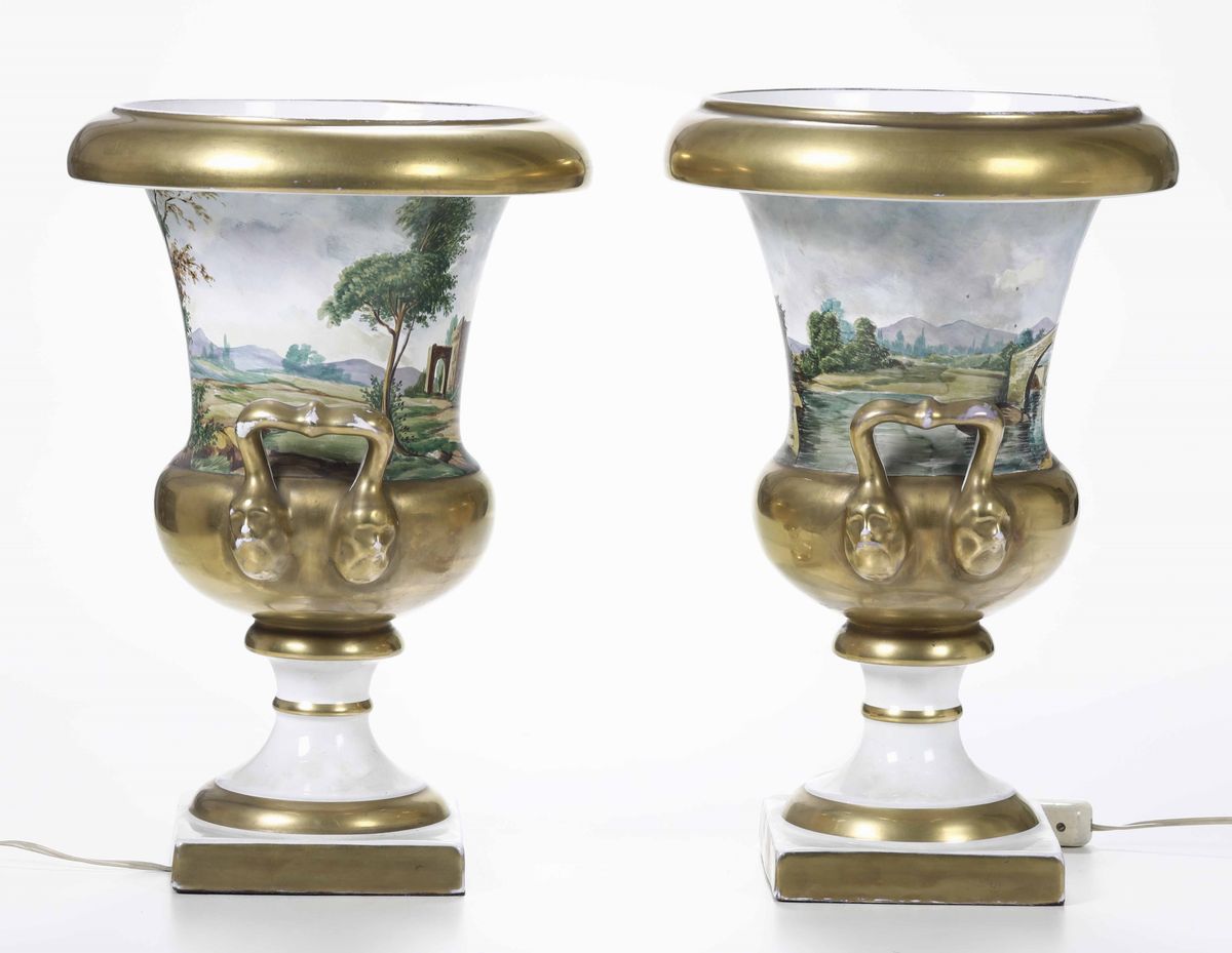I vasi “Medici” in stile Impero sono montati a lampada. La decorazione policroma a paesaggi è eseguita da un pittore indipendente