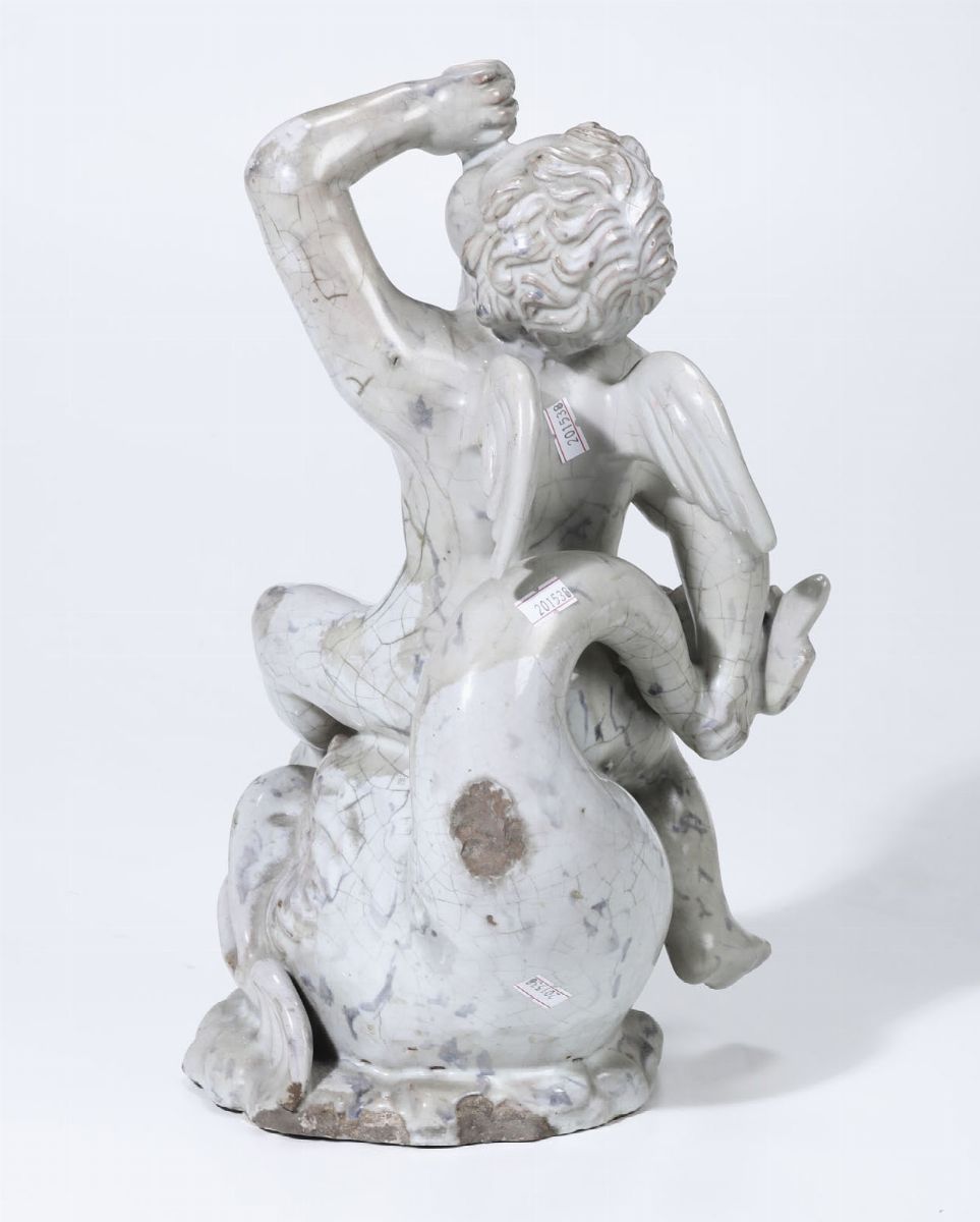 La scultura raffigura un putto alato a cavallo di un delfino