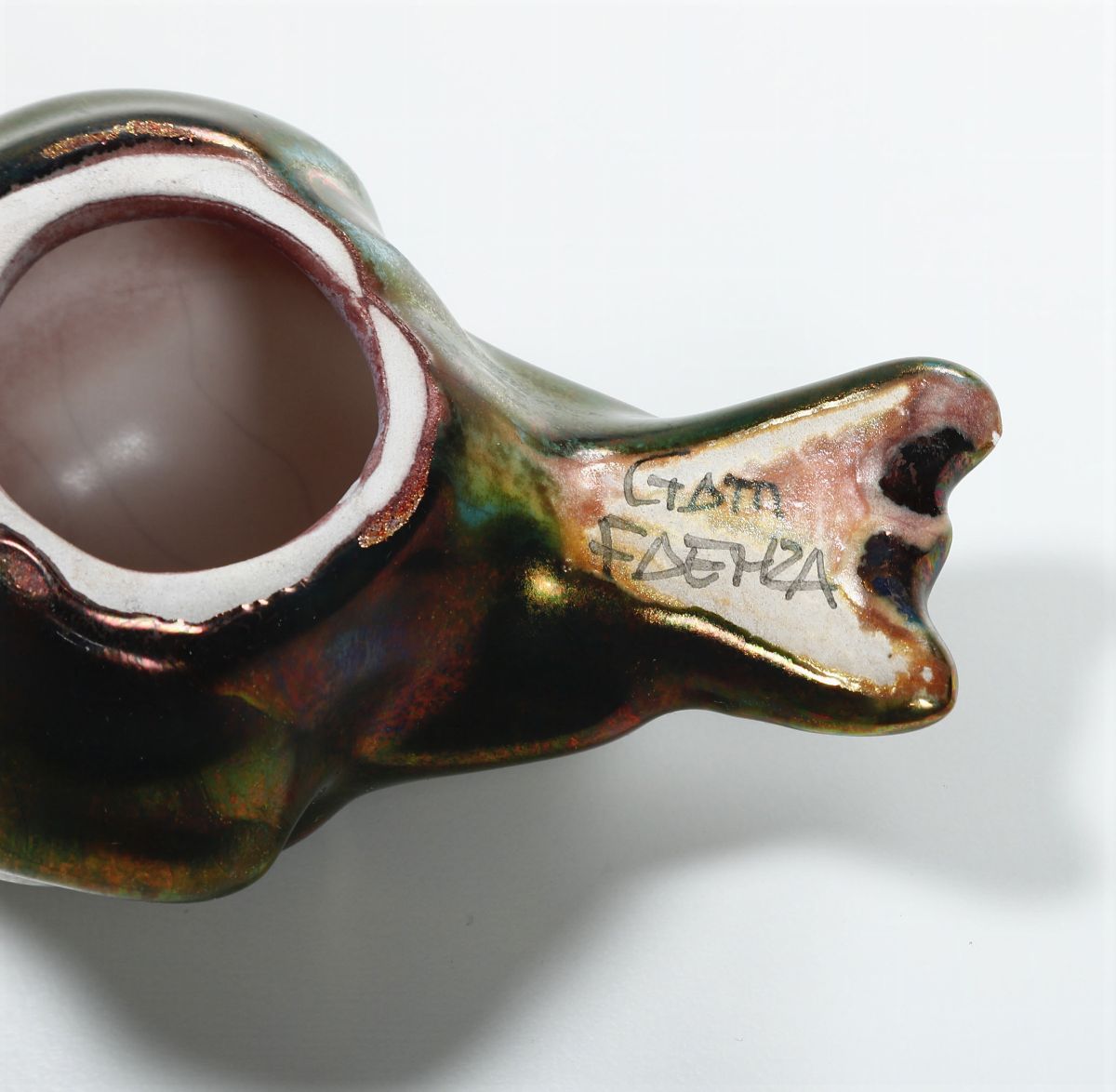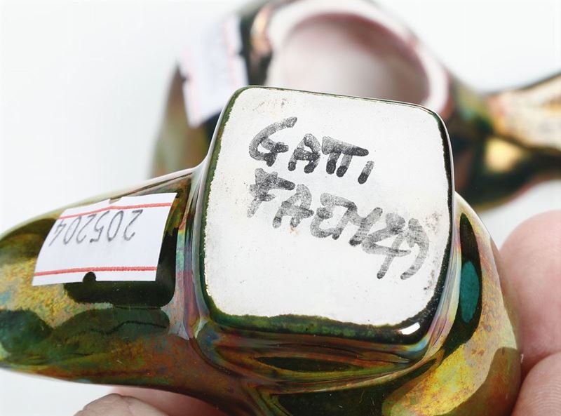 Maiolica policroma a lustro. Marca: “Gatti Faenza” in nero. Altezza massima cm 7,4. Buono stato di conservazione, due uccellini con insignificanti sbeccature