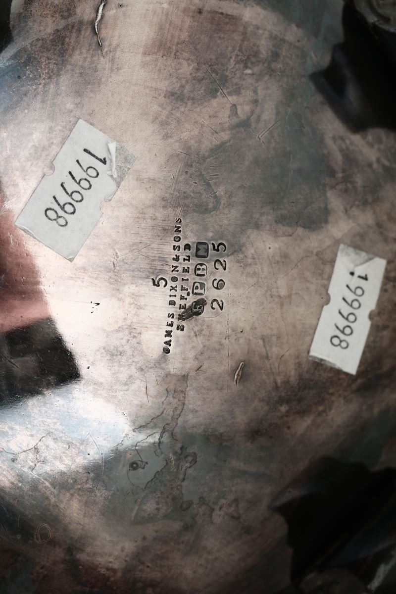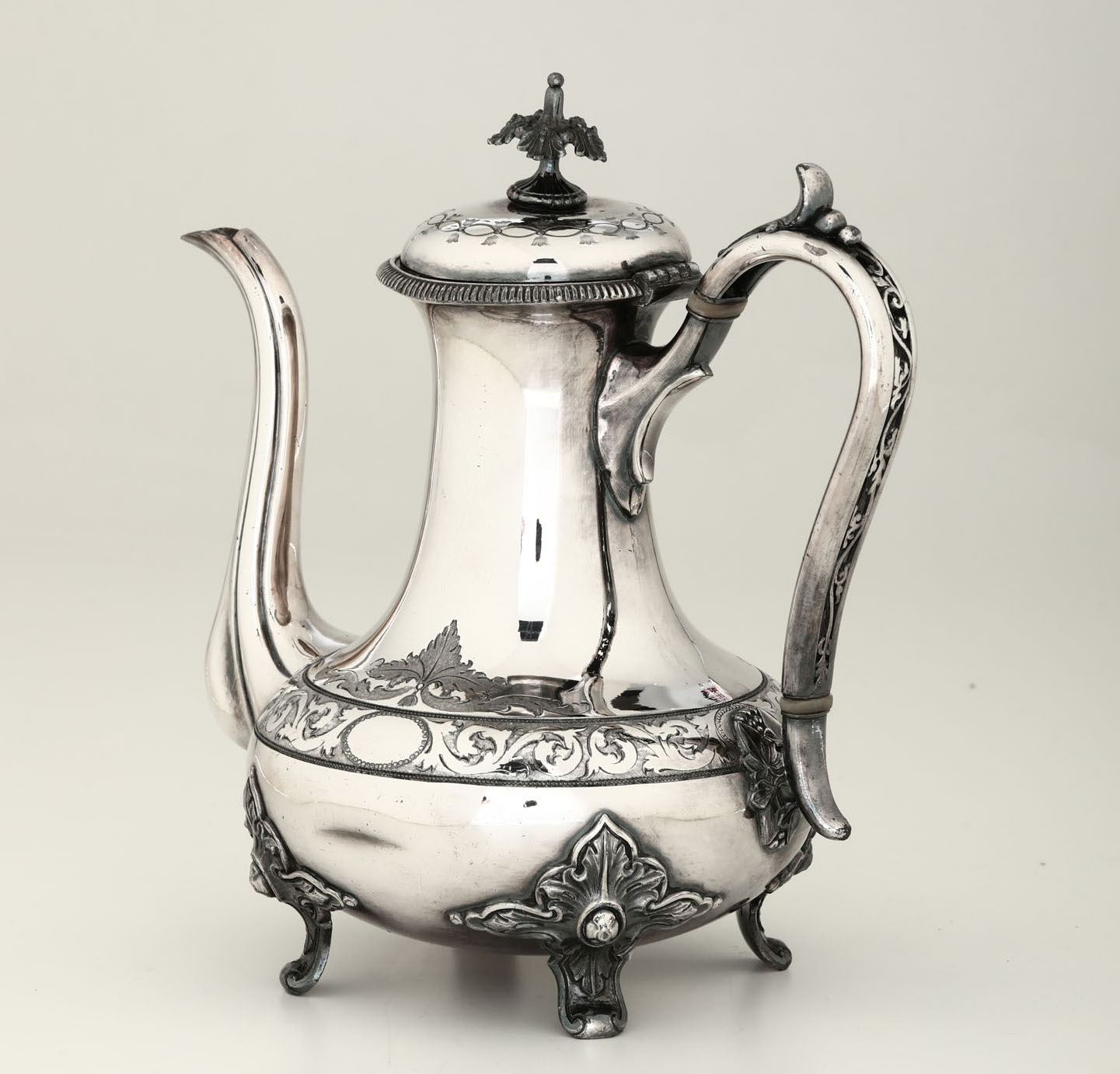 Caffettiera in metallo argentato con decoro vegetale inciso, XX secolo