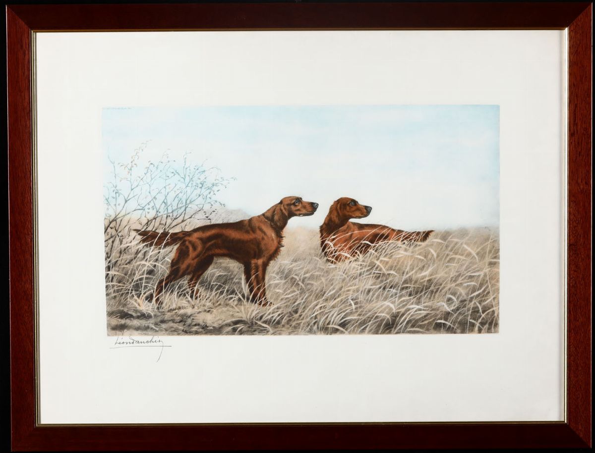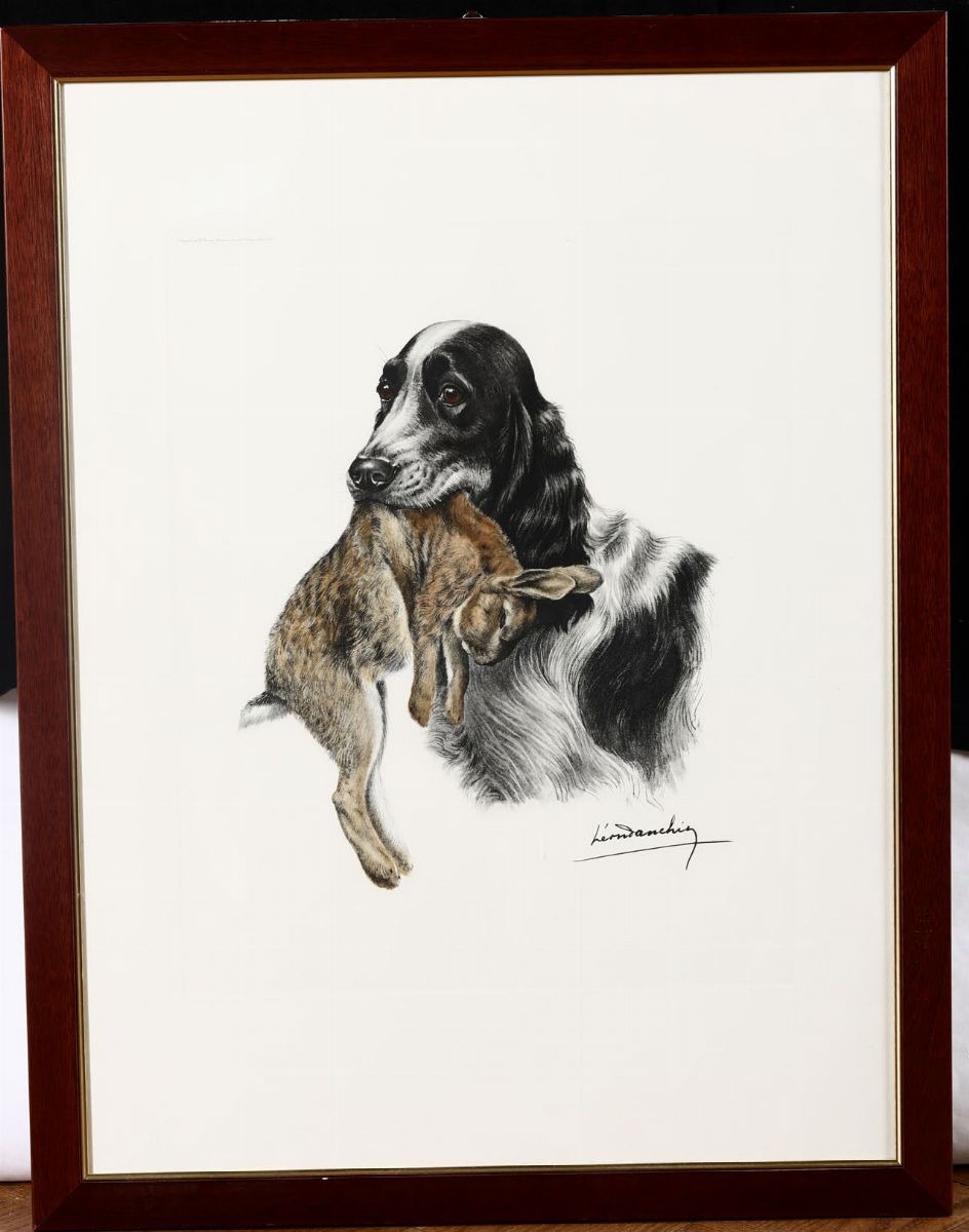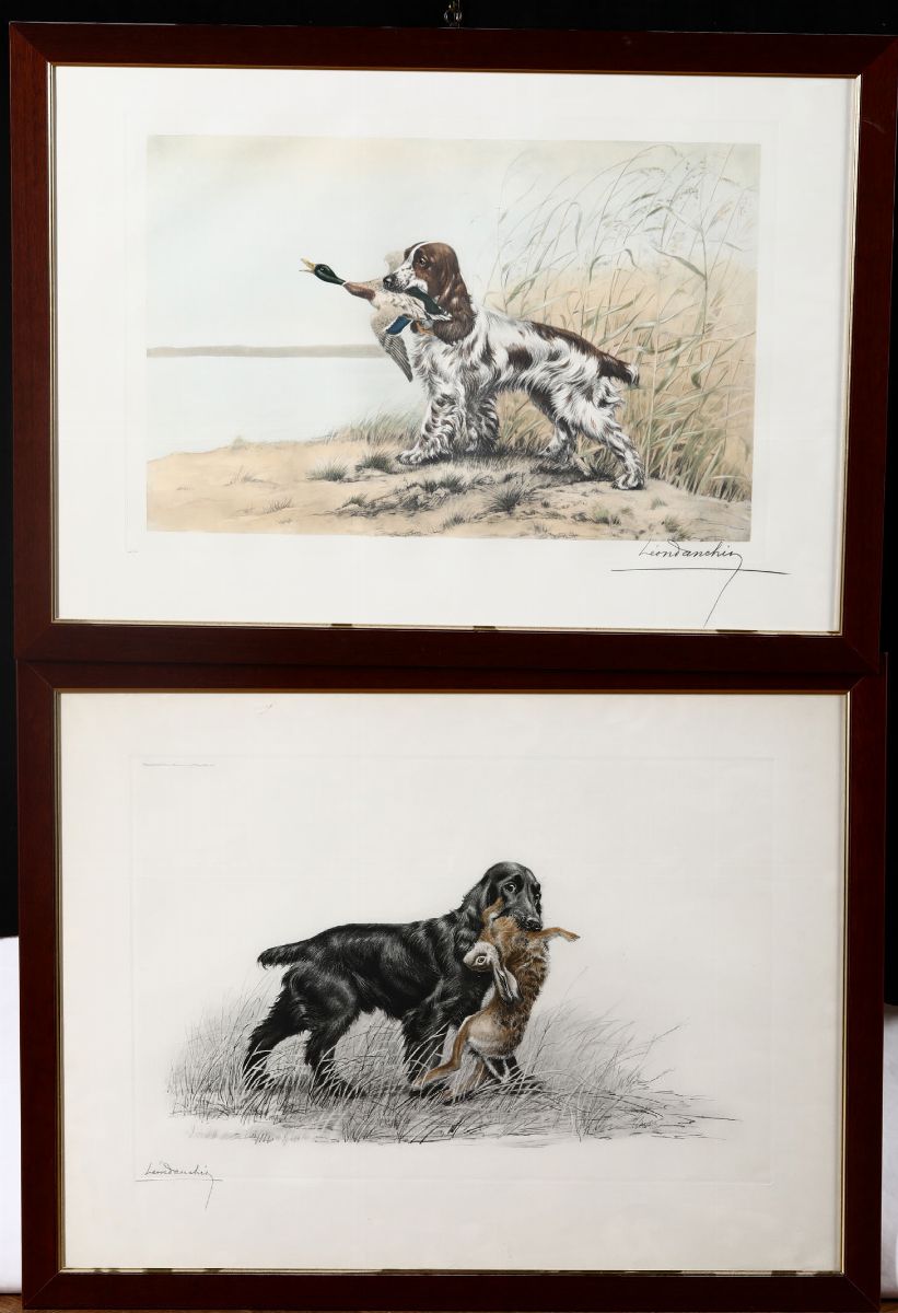 Cinque stampe raffiguranti cani da caccia, firmate in basso a destra Leon Danchin