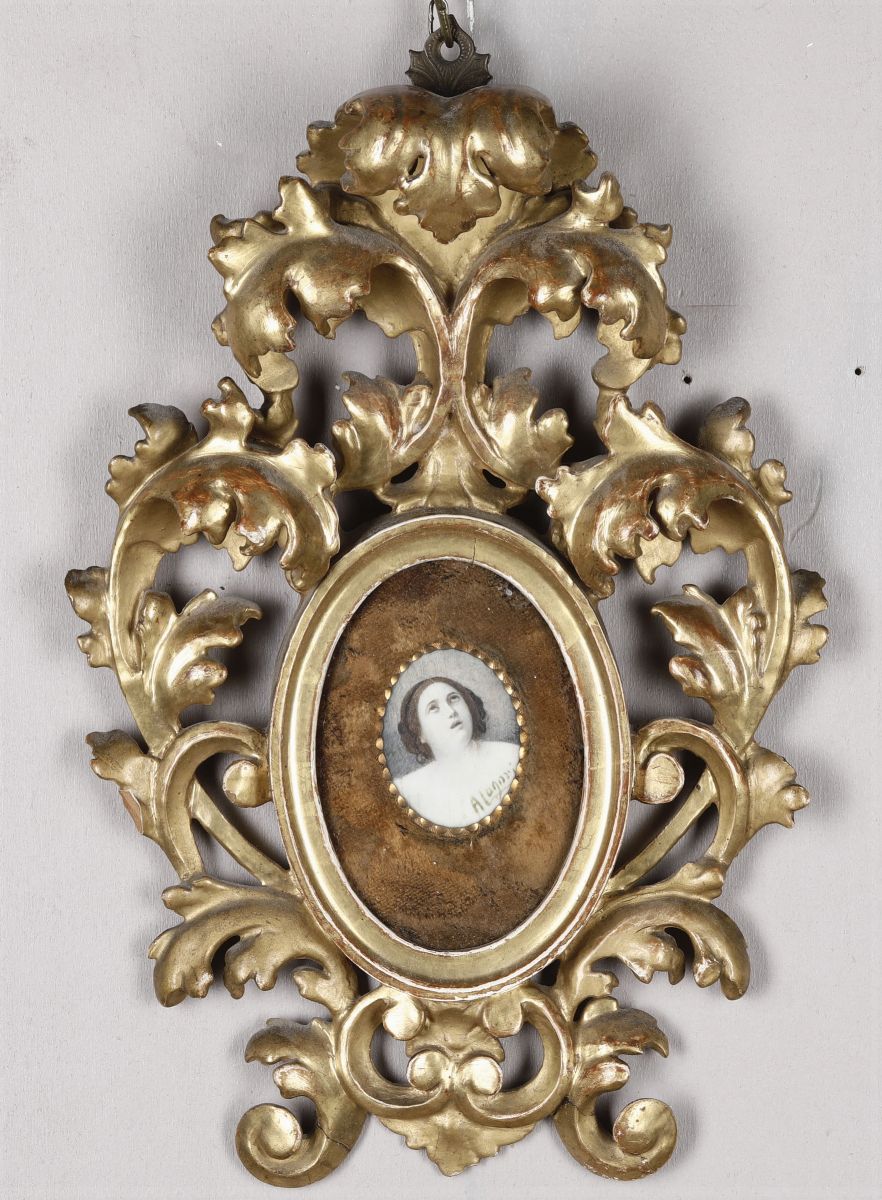 Miniatura con ritratto femminile entro cornice in legno intagliato e dorato