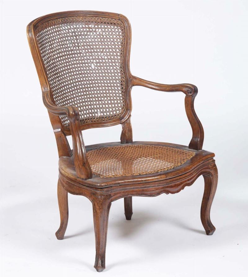 Poltroncina in noce di forma Luigi XV, XVIII-XIX secolo