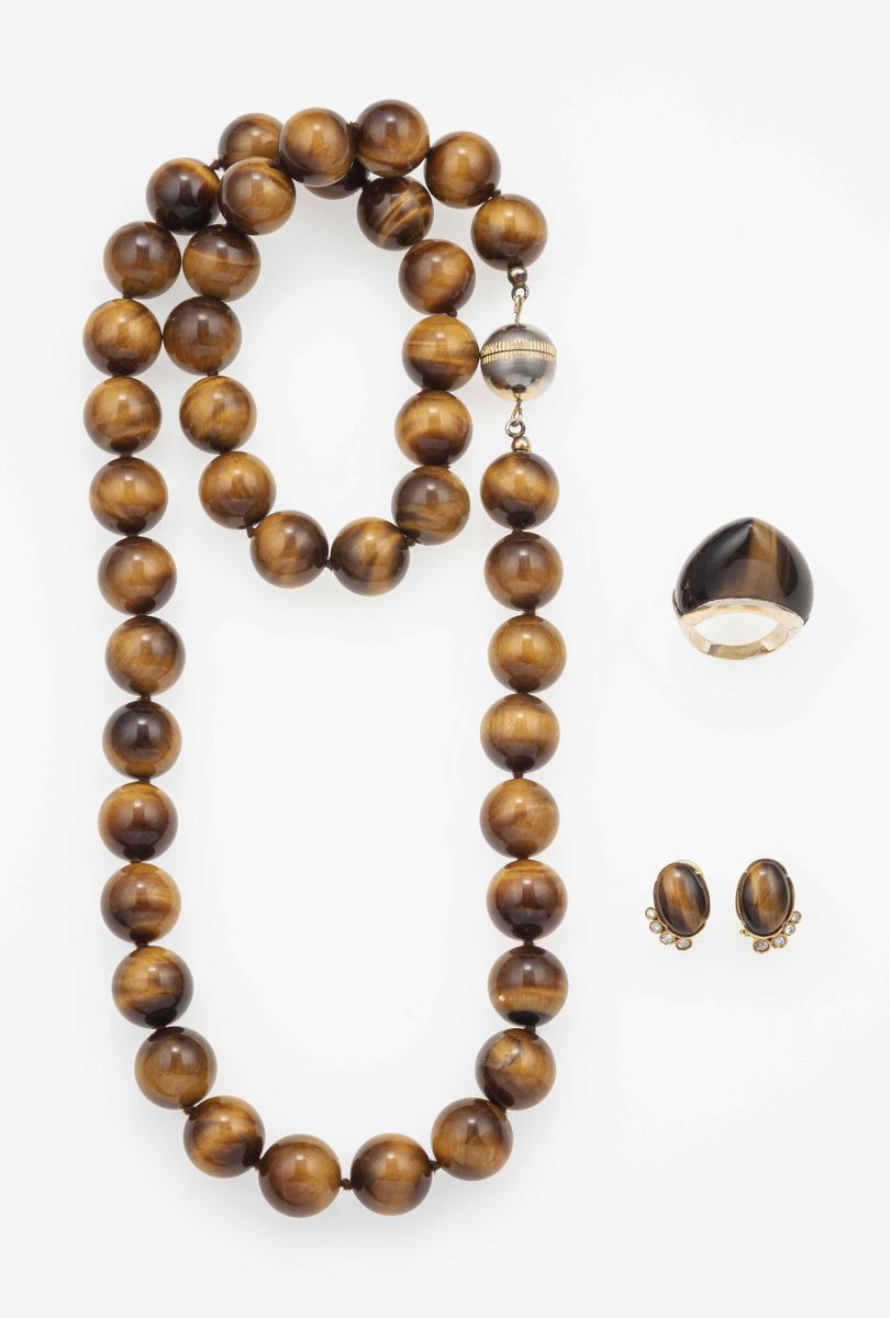 Parure composta da collana, anello ed orecchini con occhio di tigre
