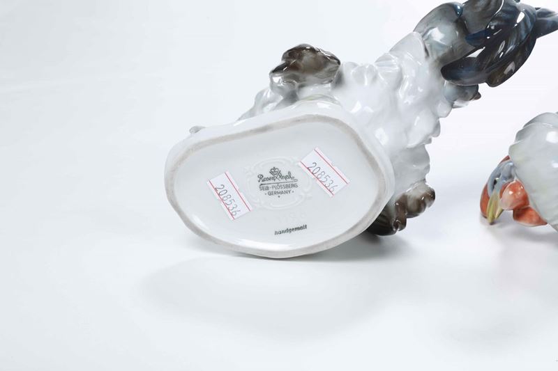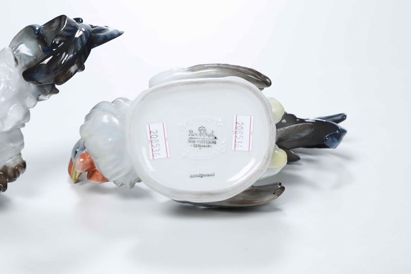 Porcellana policroma. Marca: “Rosenthal” coronata tra due bastoni incrociati e “Selb-Plössberg Germany handgemalt” in verde. Dimensioni: h. cm 14,7x19,8x8,8; h. cm 15,8x18,7x9,7. Ottimo stato di conservazione