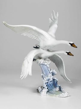 Grande gruppo con due cigni in volo Germania, Selb (Baviera), Manifattura Hutschenreuther, seconda metà del XX secolo Modello [..]