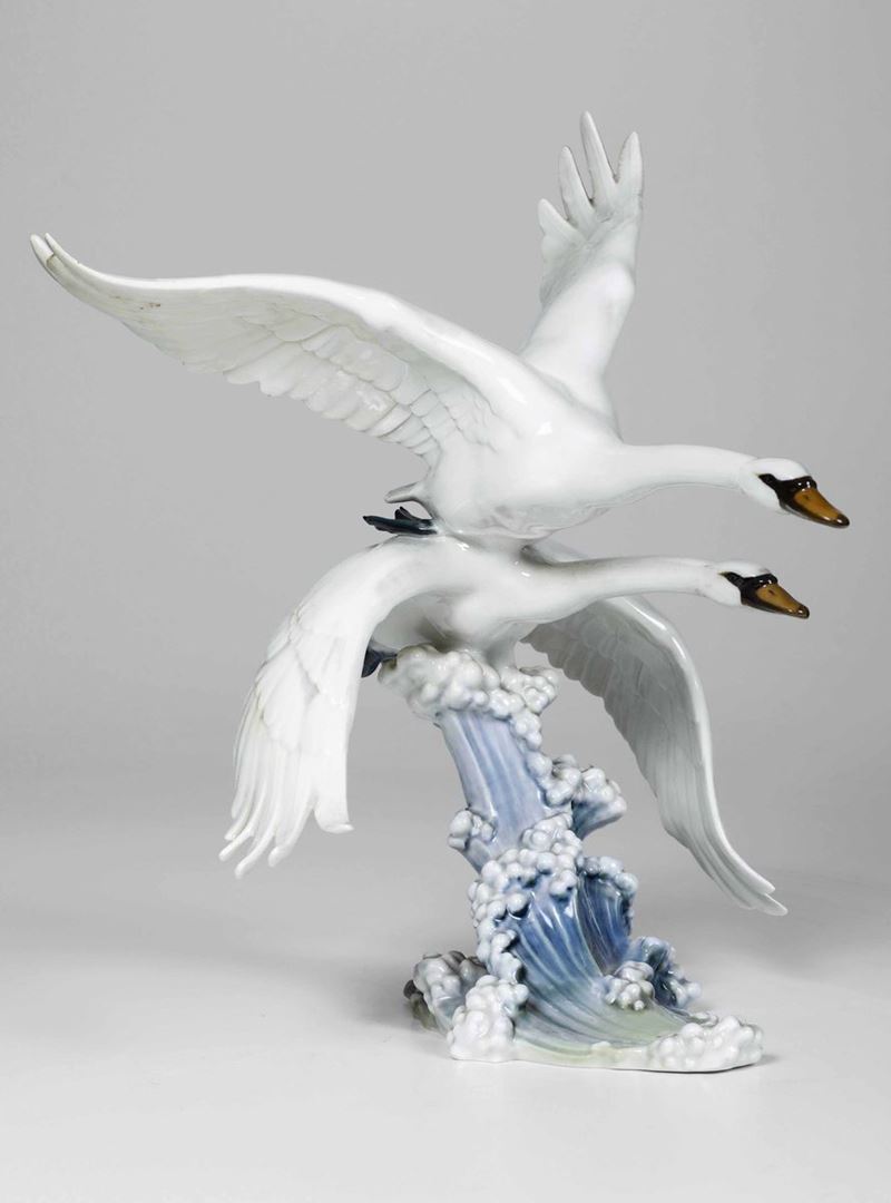 Grande gruppo con due cigni in volo Germania, Selb (Baviera), Manifattura Hutschenreuther, seconda metà del XX secolo Modello di Hans Achtziger (1918-2003)