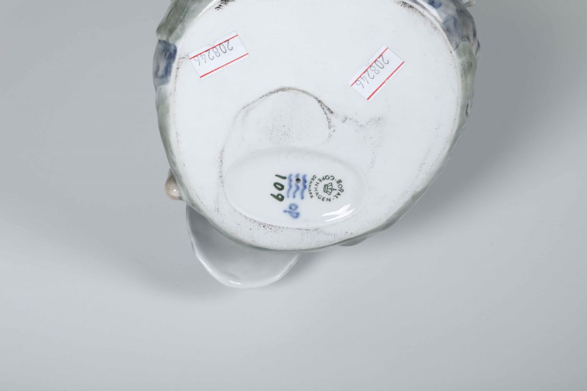 Porcellana policroma. Marca: “ROYAL COPENHAGEN DENMARK” con corona, numero “109” in verde; onde e “OP” in blu. Dimensioni: h. cm 40x19x18. Ottimo stato di conservazione