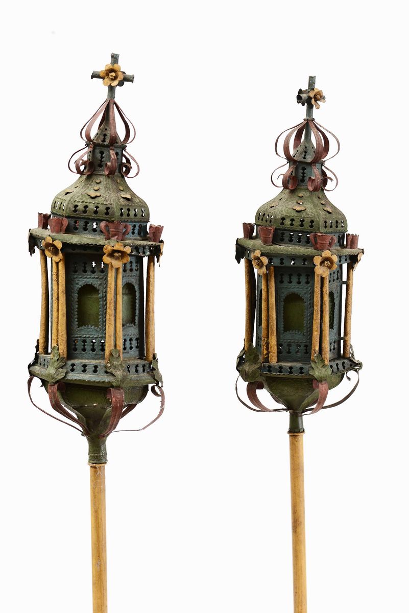 Coppia di lampioni da processione in metallo dipinto, XVIII-XIX secolo