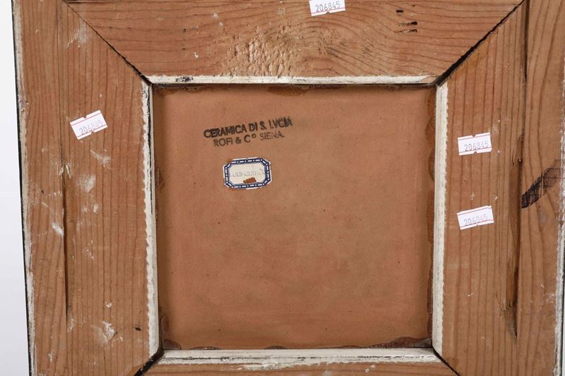 Placca in ceramica dipinta raffigurante la contrada dell'Oca, in cornice in legno, firmata Dino Rolfi