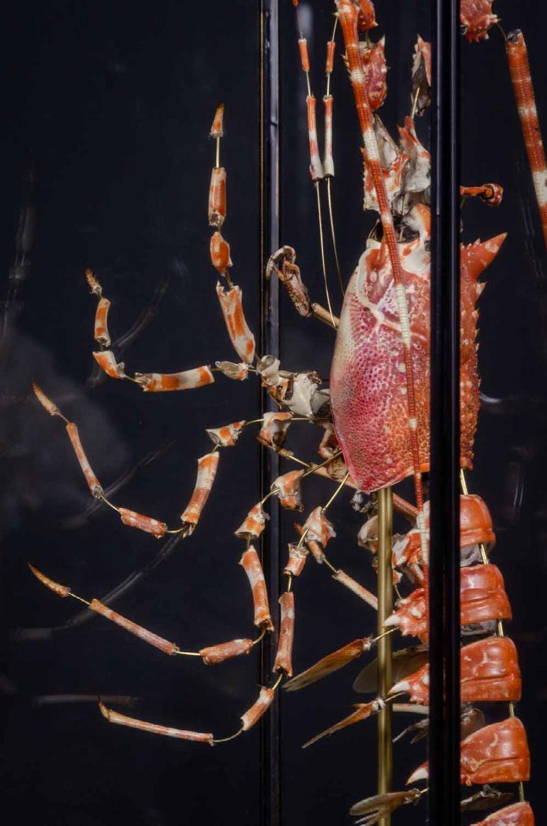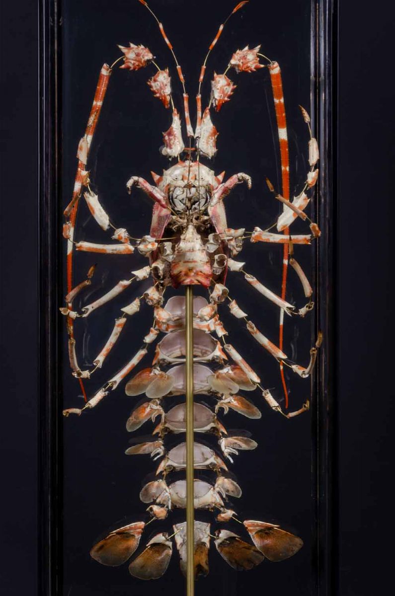 Preparazione anatomica di esoscheletro di aragosta, in teca di vetro