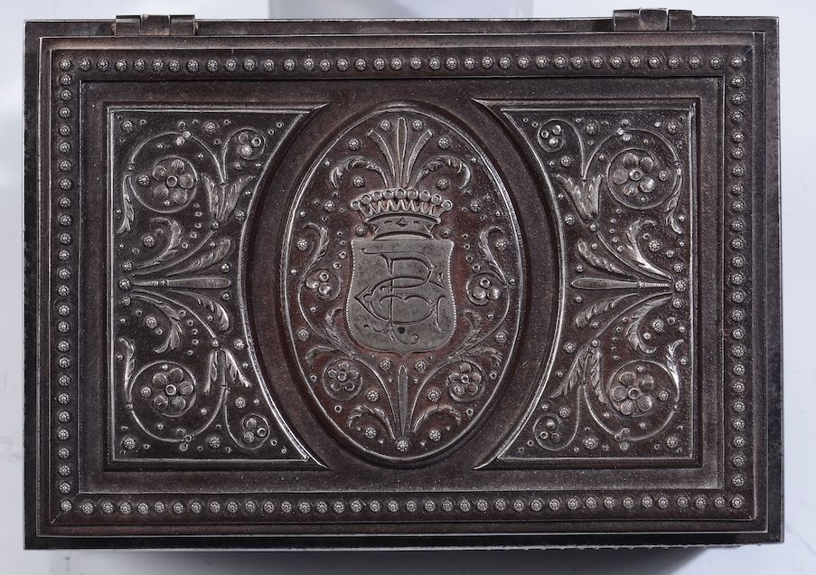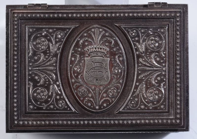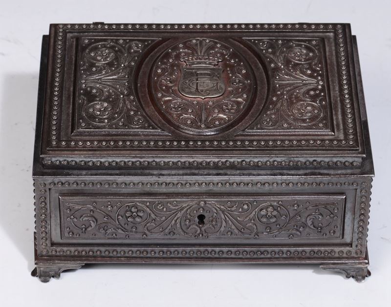 Cofanetto rettangolare in ferro fuso e cesellato, firmato Att. Tosetti Vicenza 1904, arte italiana del XX secolo