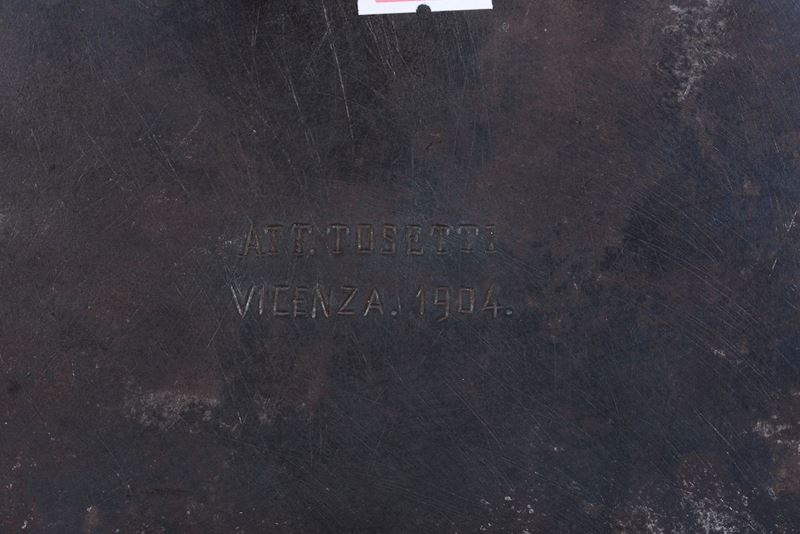 Attilio Tosetti fu attivo a Vicenza a cavallo tra il XIX ed il XX secolo. Tra le sue opere si ricorda l’esecuzione dei ceselli per la corona della Madonna del Monte Berico eseguita nel 1890 dalla bottega orafa di Angelo Marangoni