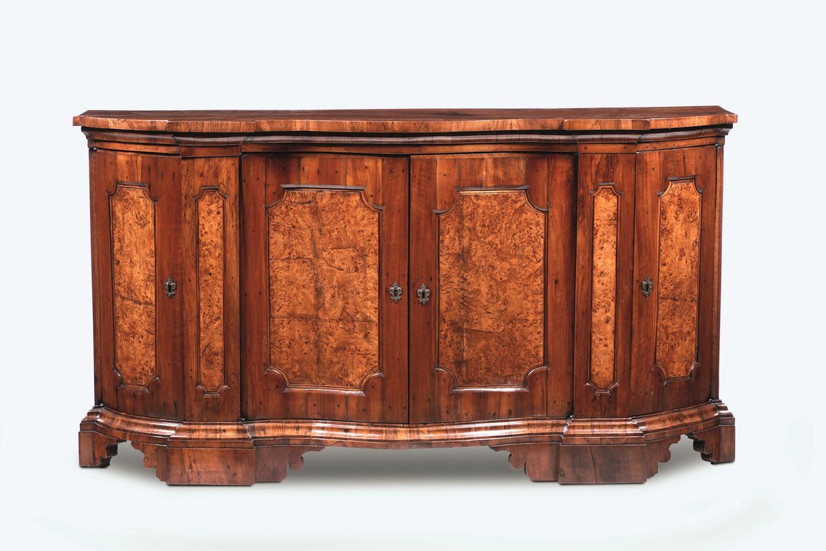 Credenza in legno a quattro ante lastronata in noce e radica, XVIII-XIX secolo