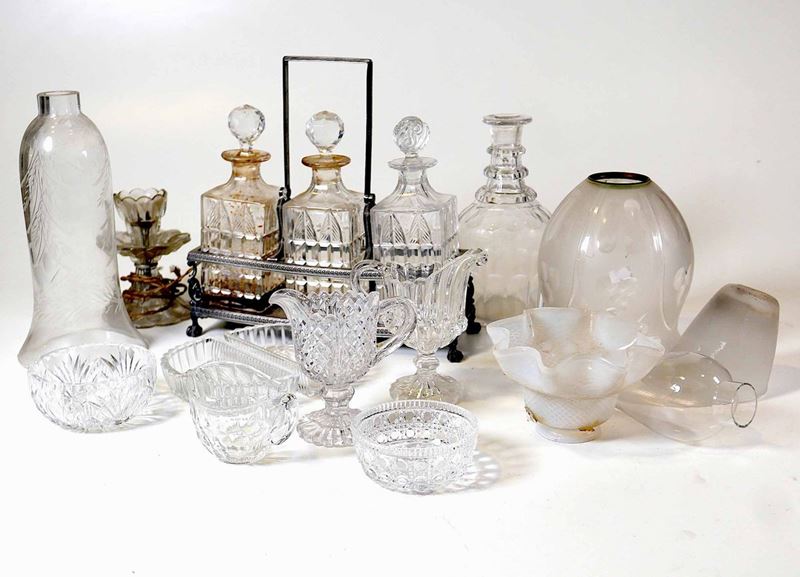 lotto misto di oggetti in vetro e cristallo tra cui un centrotavola con presa in argento, coppette in cristallo bottiglie e numerosi vetri di lampade