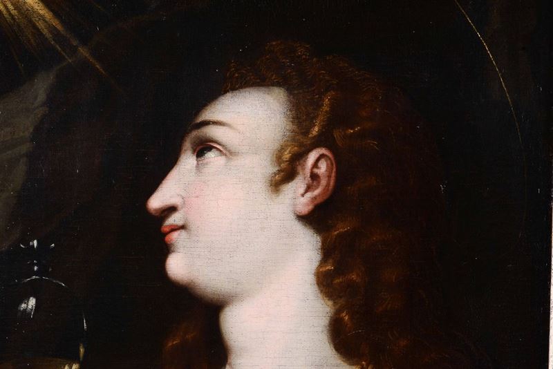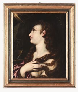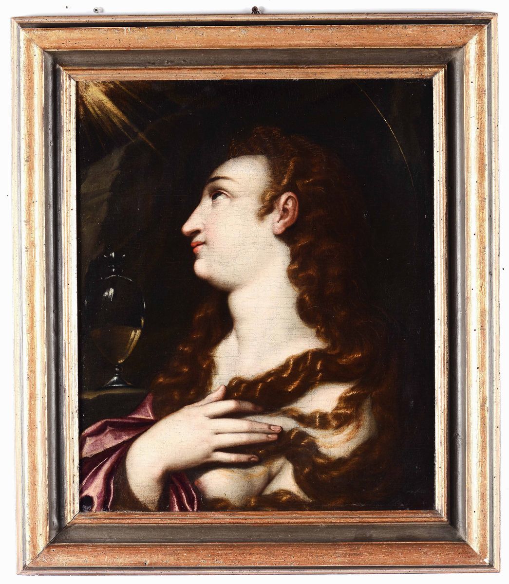 Questa Maddalena in contemplazione, identificabile per l'ampolla di cristallo che allude all'episodio evangelico nel quale ella profumò i piedi di Gesù con un unguento prezioso, è stata dipinta da Hendrick Goltzius dopo il viaggio a Roma. . Proprio l'ampolla di vetro documenta le ricerche in questa direzione che andarono sviluppando Ambrogio Figino a Milano e il giovanissimo Caravaggio a Roma. (...) Expertise Prof. Ferdinando Arisi
