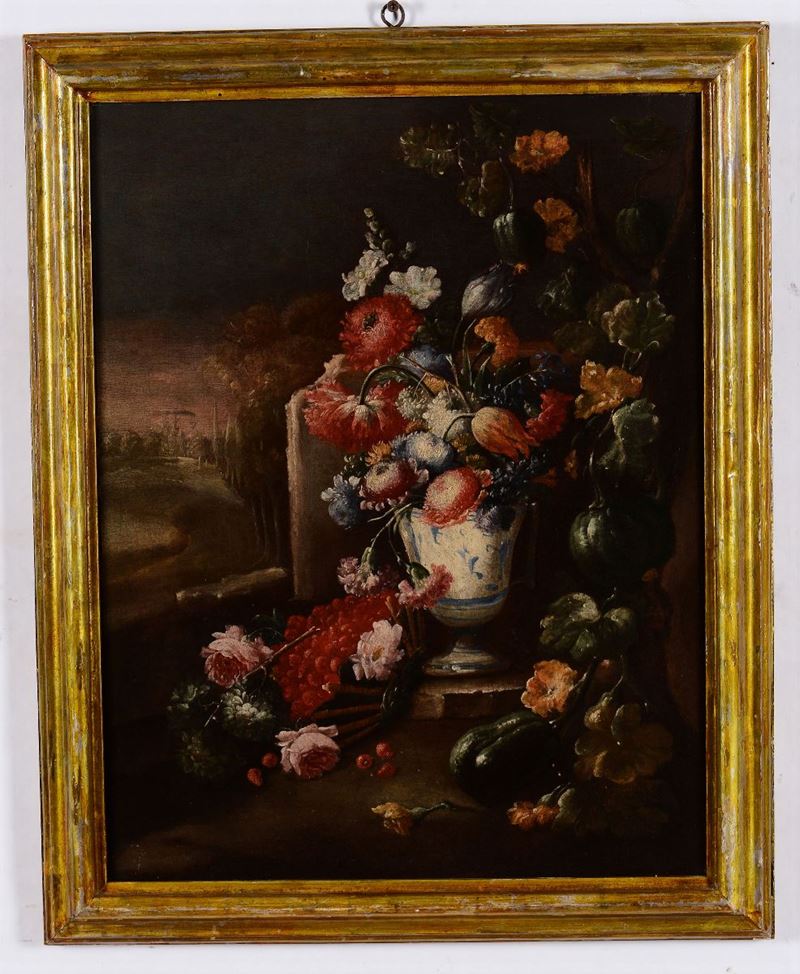 Nicola Casissa (Napoli ? - 1730), attribuito a Composizione di fiori e frutta con paesaggio
