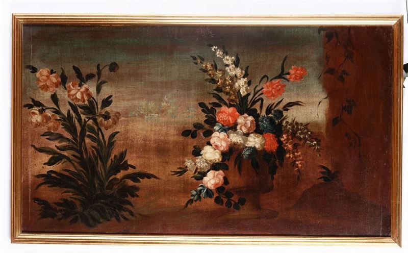 Scuola del XVIII secolo Scorcio architettonico con fiori