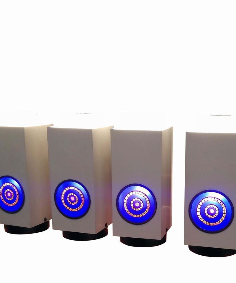Sei lampade da tavolo mod. 13090 con struttura in metallo laccato, diffusore in vetro trasparente e vetro a murrina di Venini.
