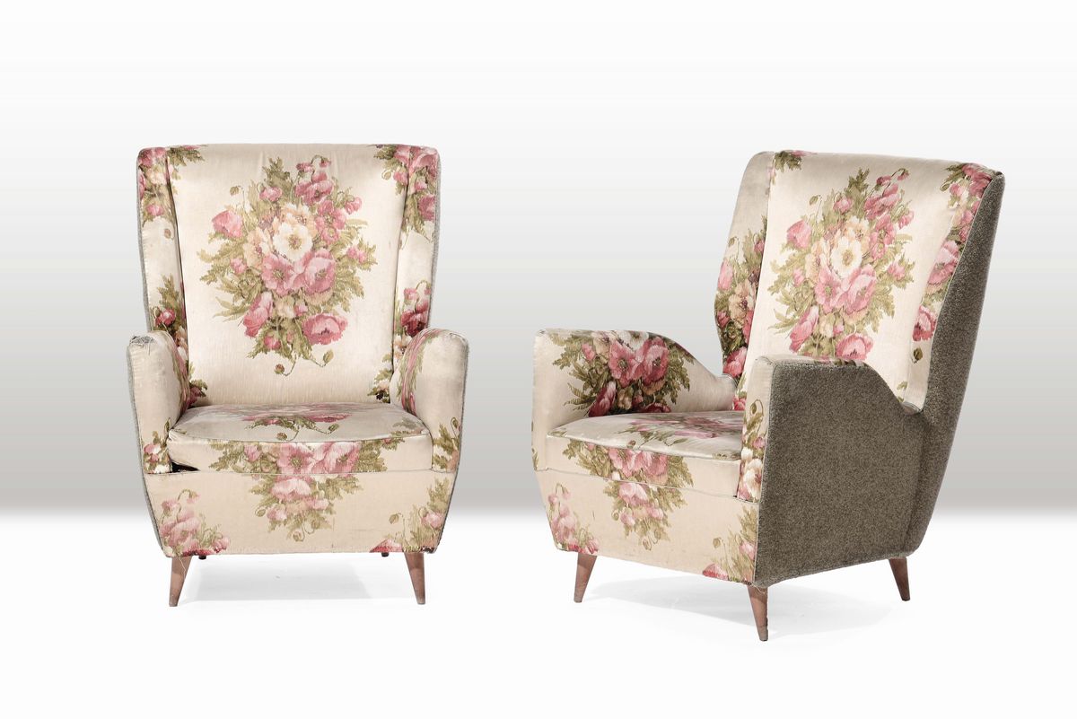 Coppia di poltrone con piedini troncoconici in legno e rivestimento in tessuto.