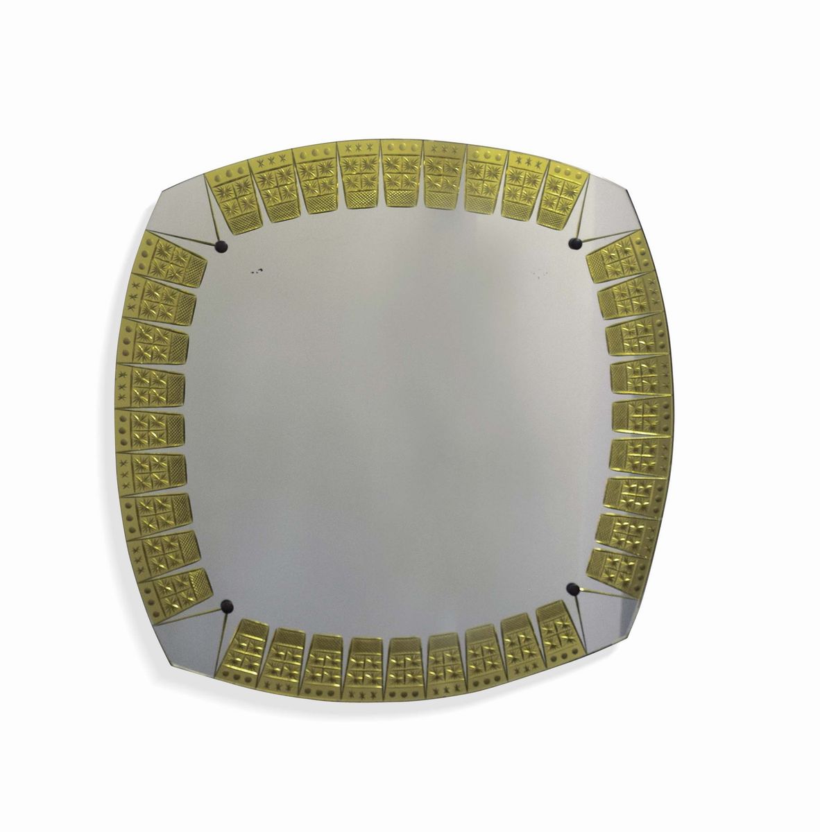 Specchio da parete con struttura in legno e vetro specchiato, colorato e inciso.