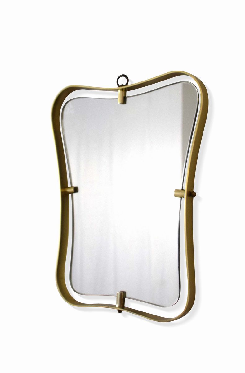 Specchio da parete con cornice in ottone e vetro specchiato e molato.