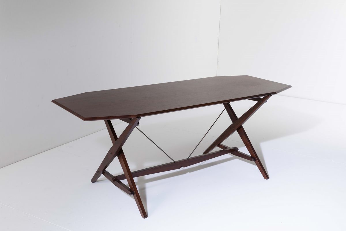 Tavolo mod. Cavalletto TL2 in legno e particolari in metallo laccato.