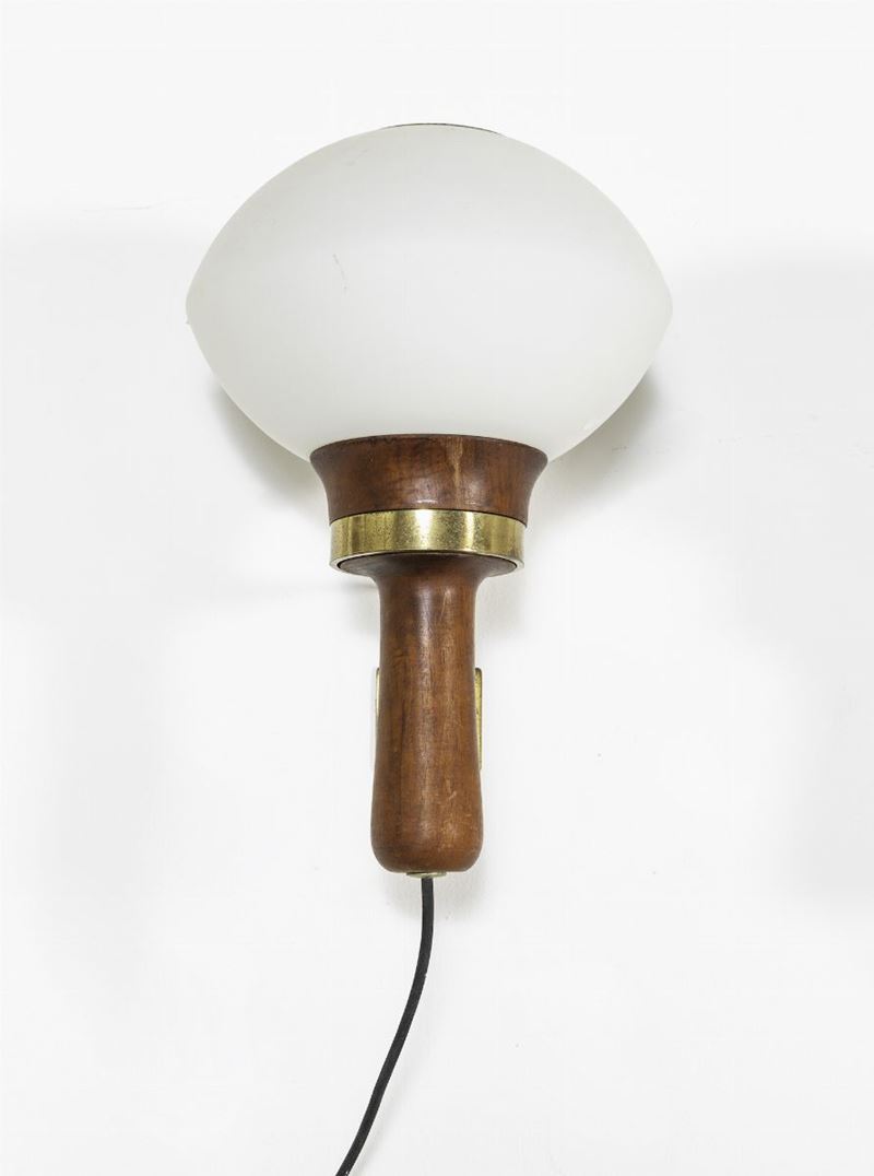 Quattro lampade da parete con struttura in ottone e legno. Diffusore in vetro opalino.