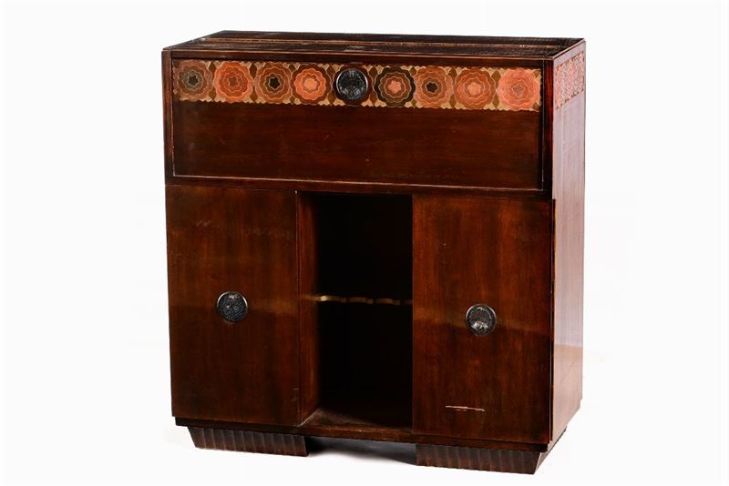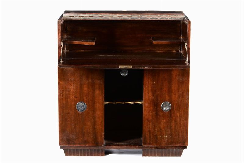Mobile contenitore con anta a ribalta, struttura in legno scolpito e intarsiato, particolari in bronzo.