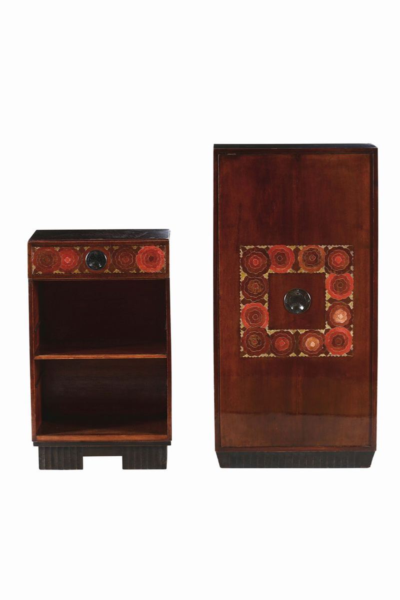 Due mobile contenitori, struttura in legno scolpito e intarsiato, particolari in bronzo.