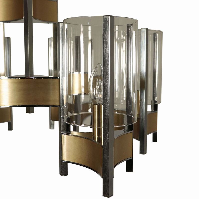 Lampada a sospensione con struttura in metallo cromato, ottone e diffusori in vetro.