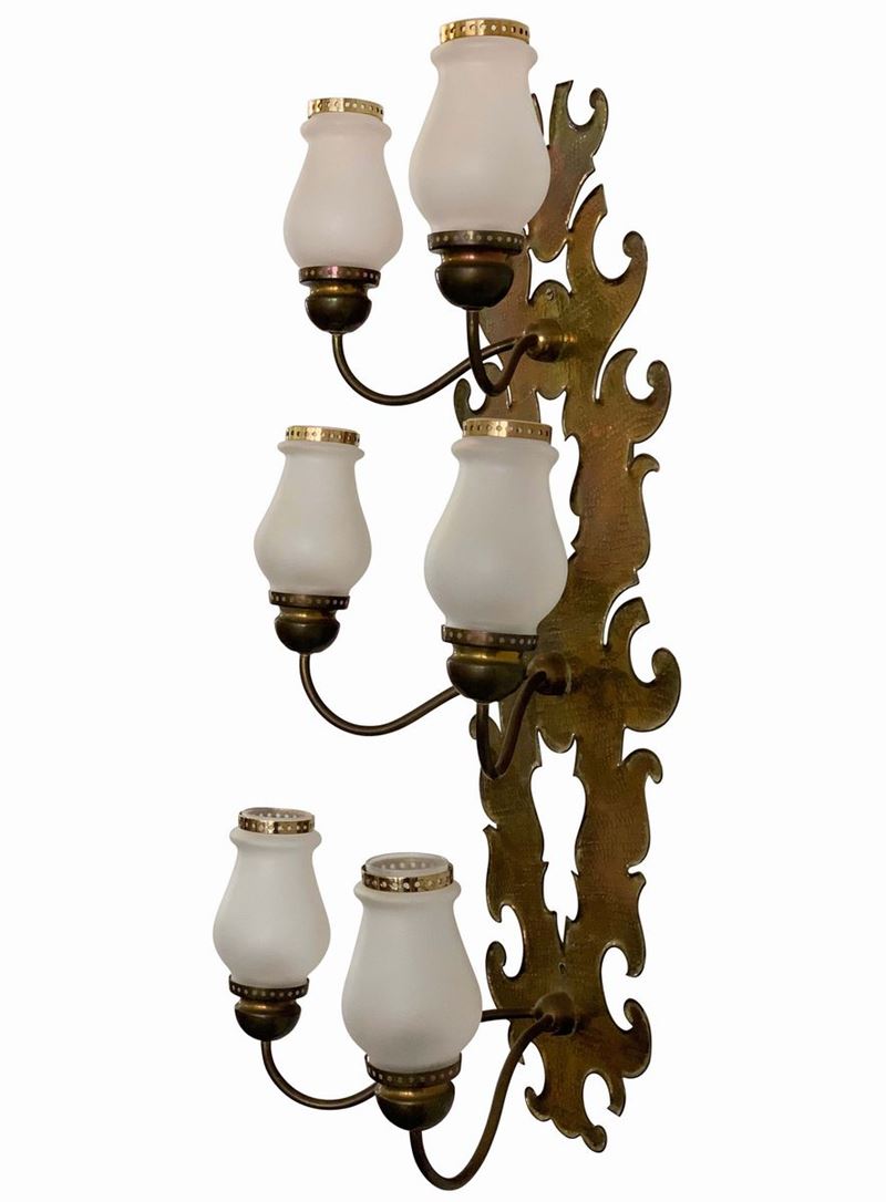 Grande lampada da parete mod. 140 B con struttura in ottone, sbalzato, traforato e martellinato e diffusori in vetro satinato.