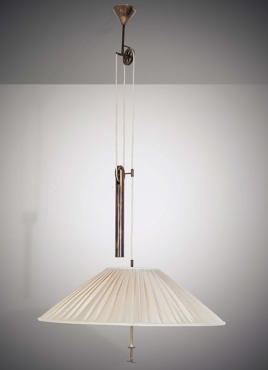 Lampada a sospensione con meccanismo saliscendi in ottone, metallo laccato e paralume in tessuto.