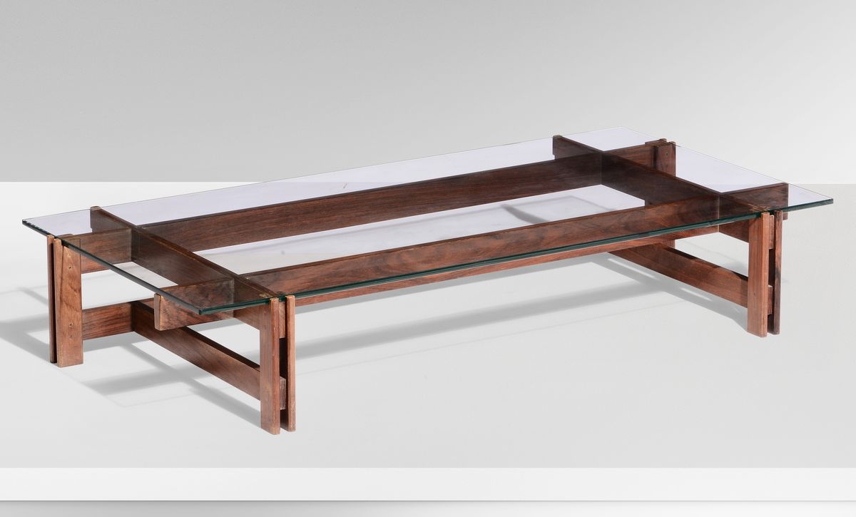 Tavolo basso mod. 751 con struttura in legno e piano in cristallo molato.