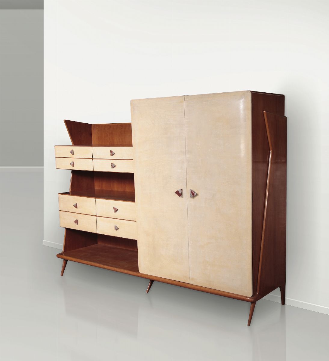Mobile contenitore con struttura in legno e rivestimento in pergamena. Dettagli in marmo.