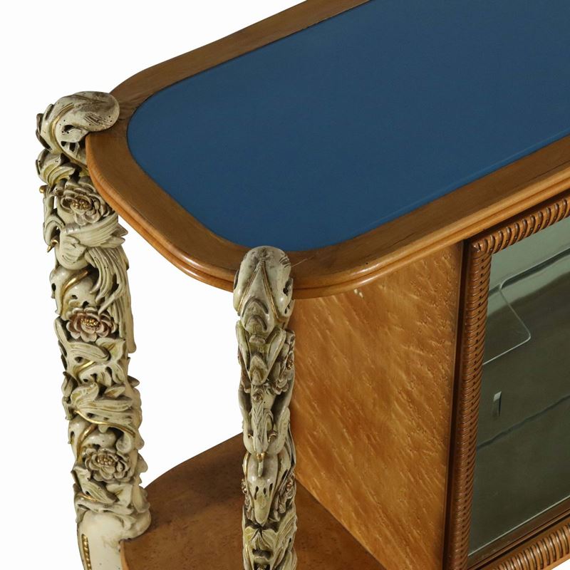 Mobile vetrina ad ante scorrevoli, con struttura in legno intagliato e legno laccato. Piani, ante e rivestimenti in vetro.