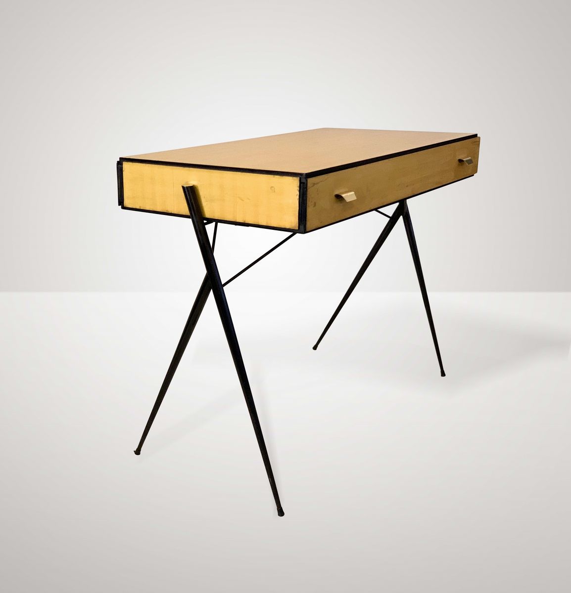 Scrivania con struttura in metallo laccato, piano in legno e particolari in ottone.